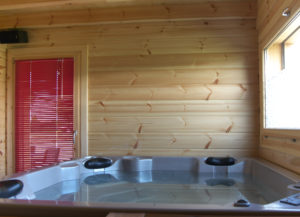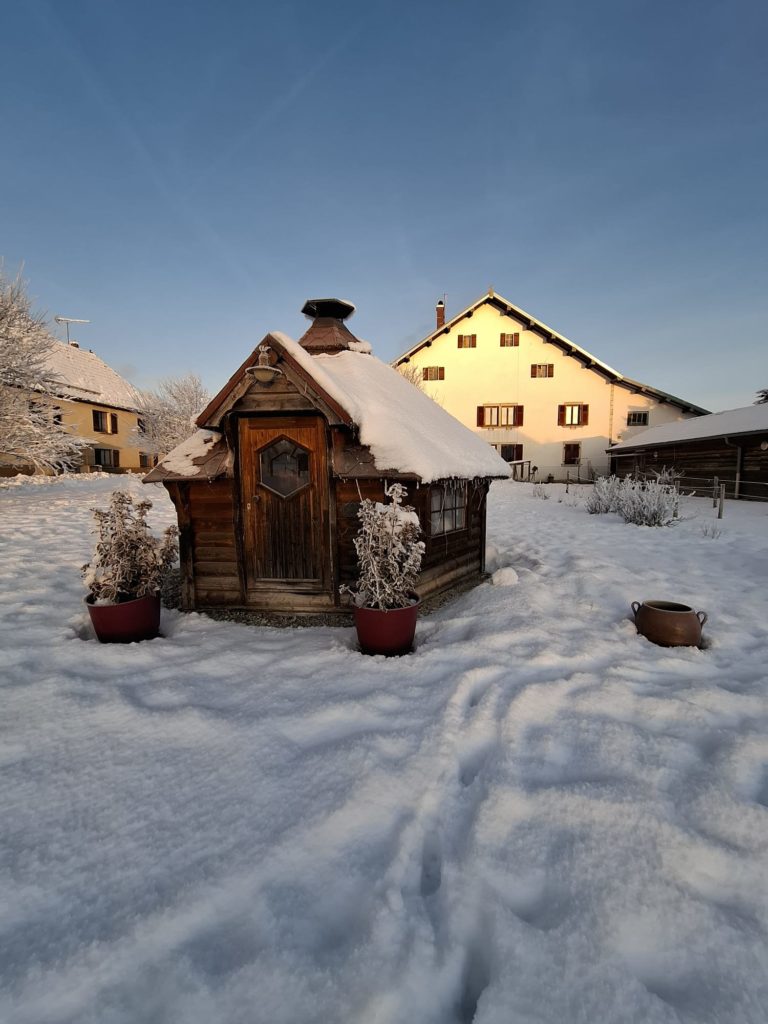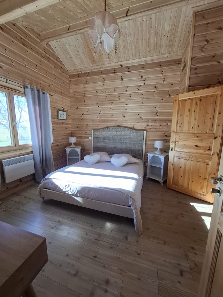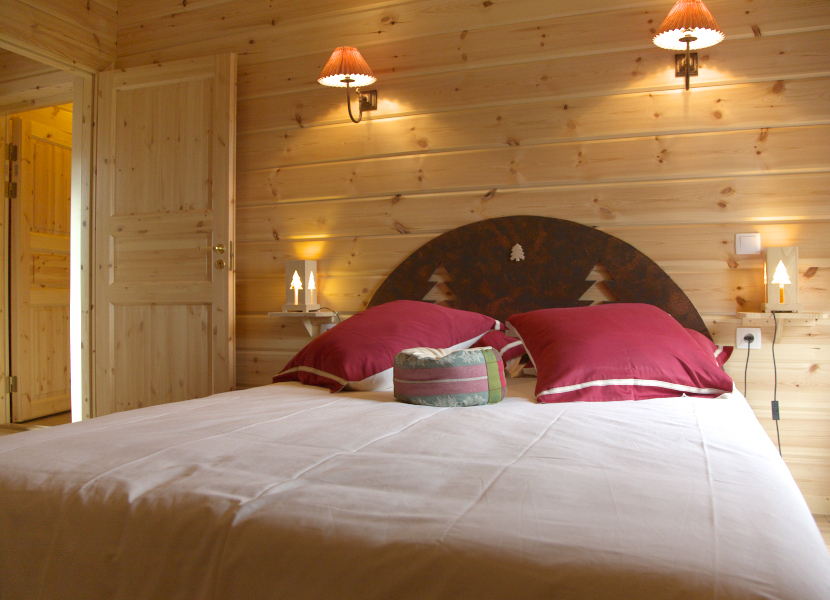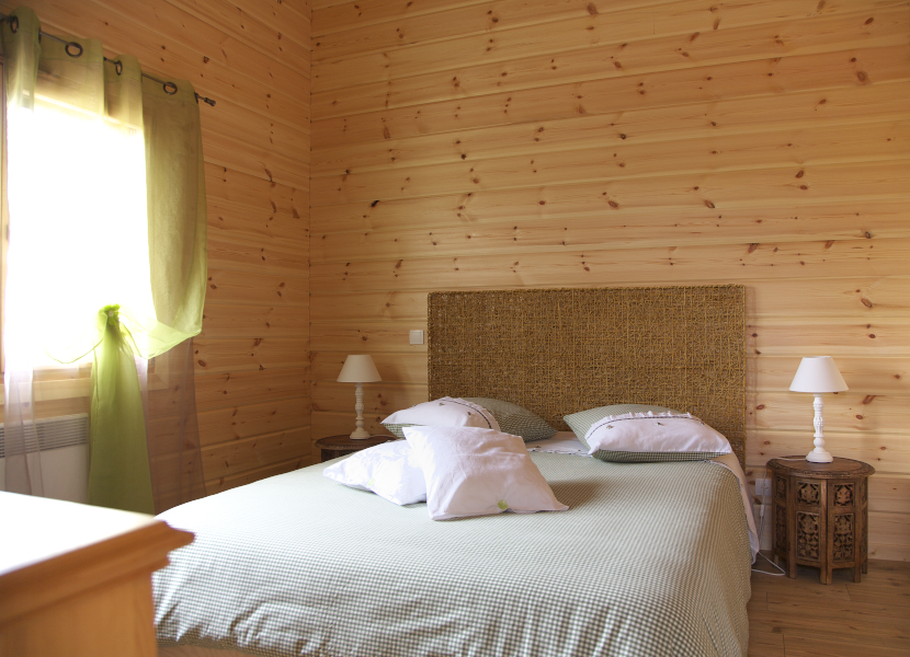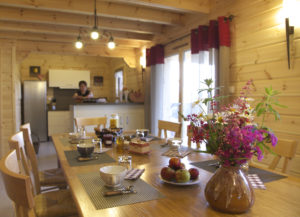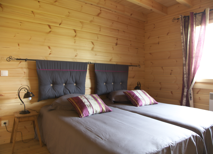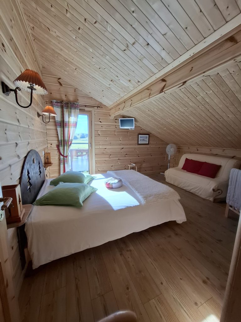 L’espace dédié aux hôtes est un chalet en madriers, à quelques mètres du vieux corps de ferme.